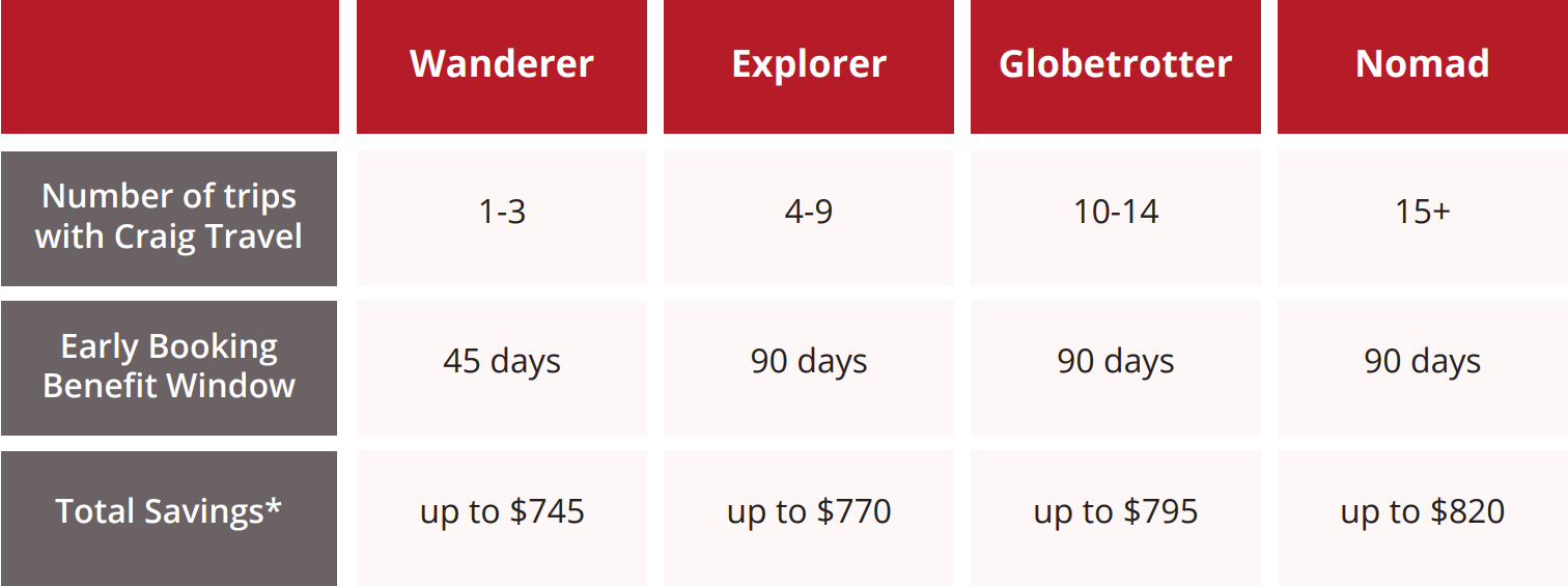 After each group journey with Craig Travel your client account will receive a set number of points that equate to savings on your next group journey. As you reach new loyalty levels you will receive even more points. Points are added to your account within one month of your return.